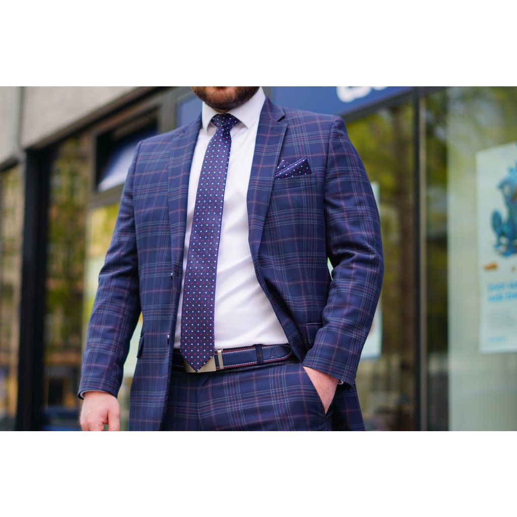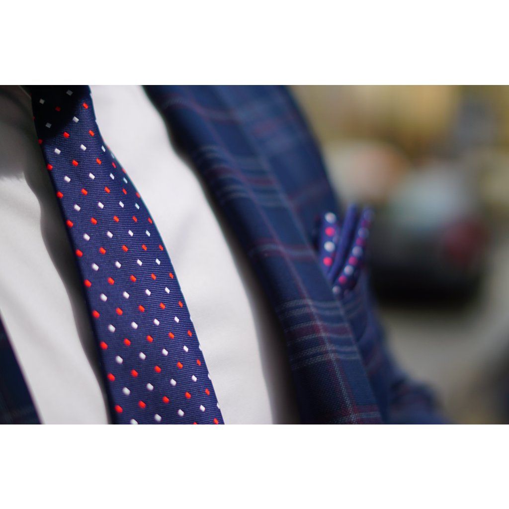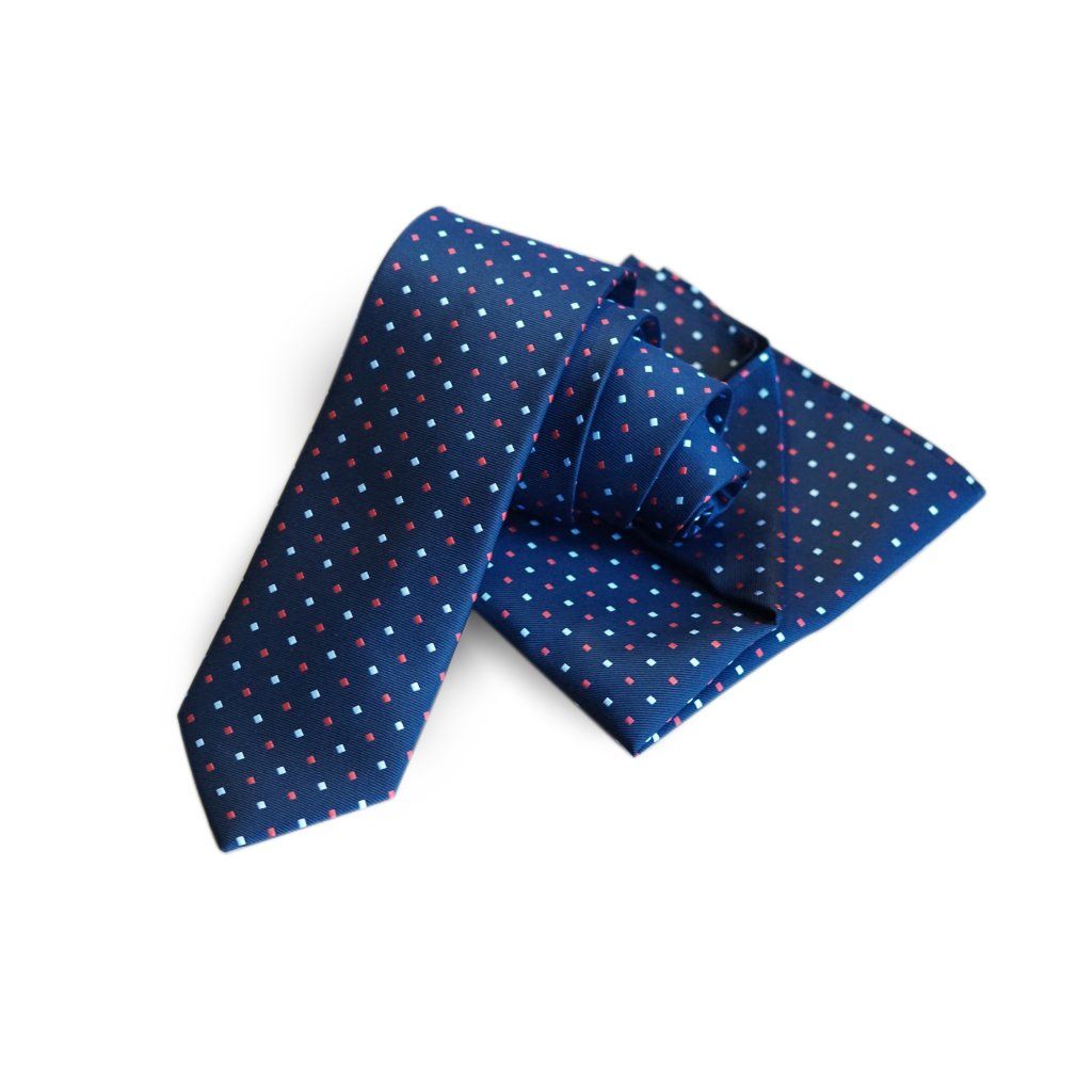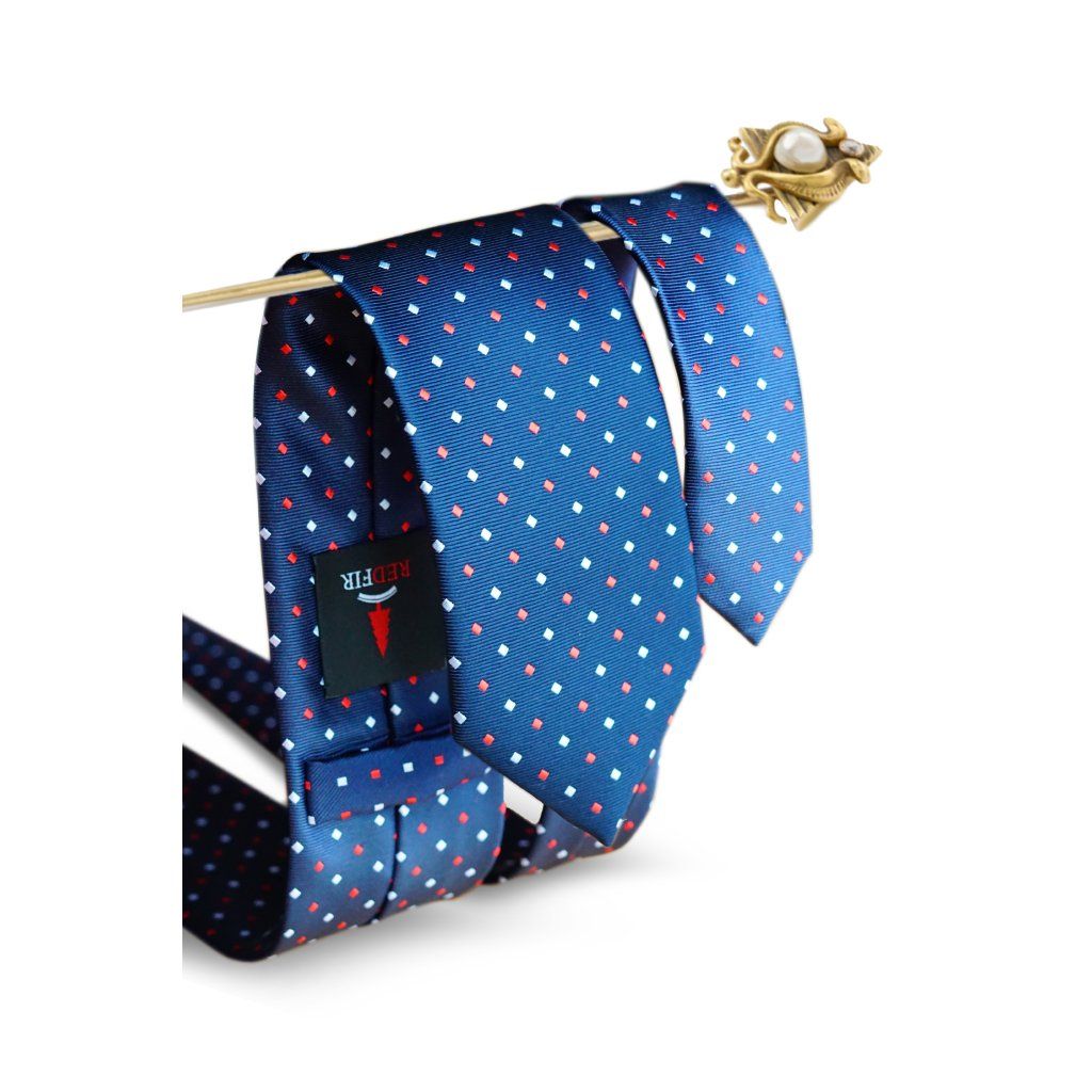 Hedvábná modrá kravata s červenými a bílými čtverečky