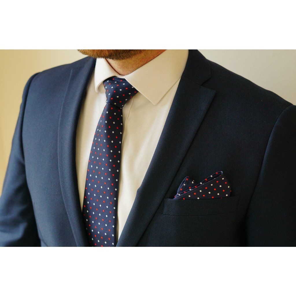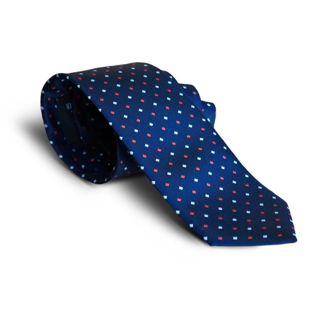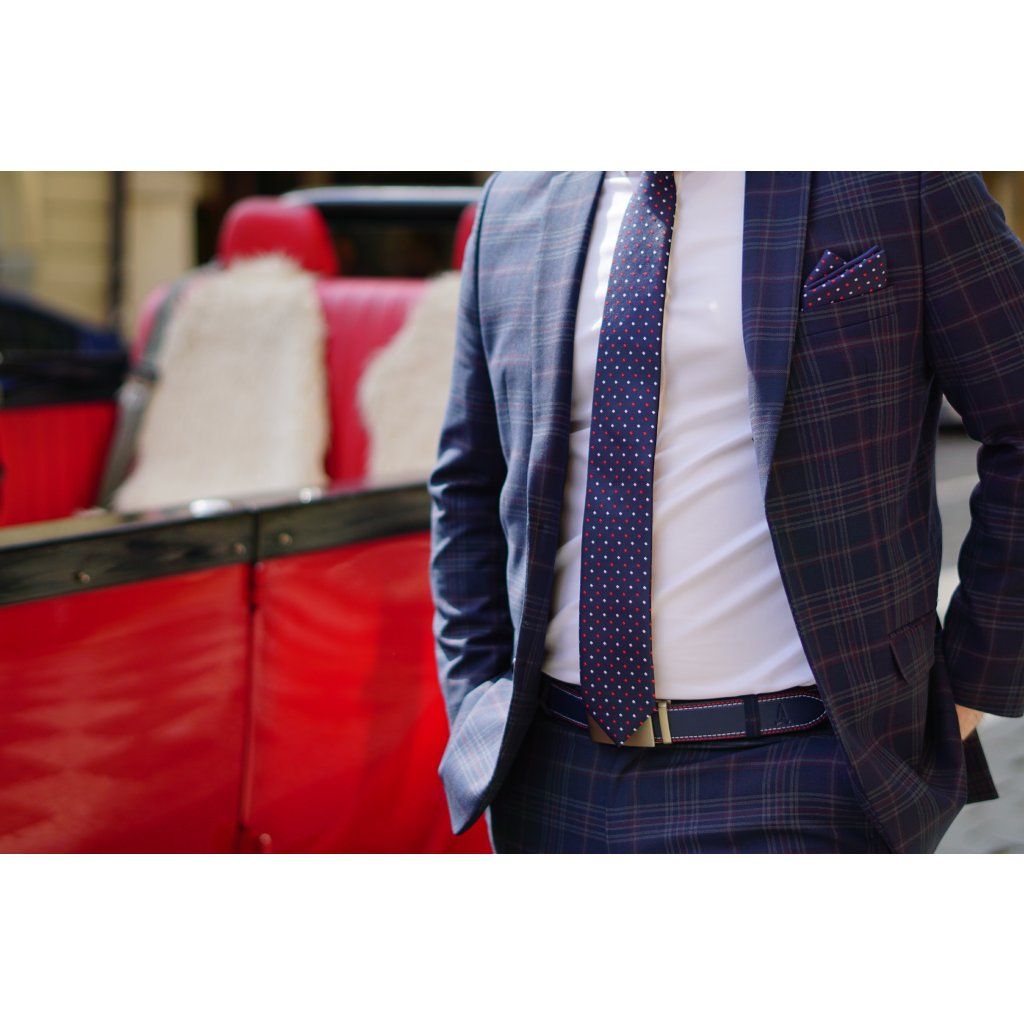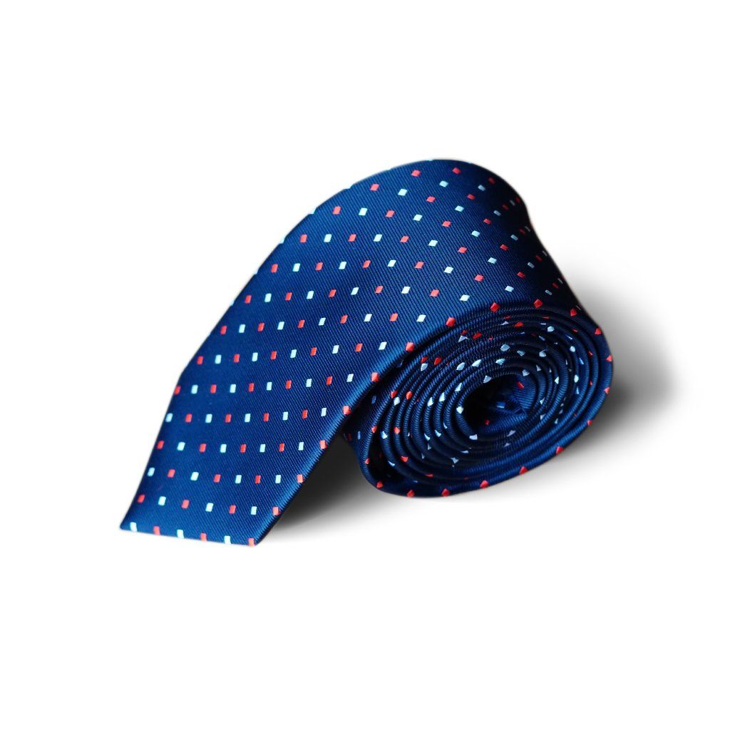 Hedvábná modrá kravata s červenými a bílými čtverečky